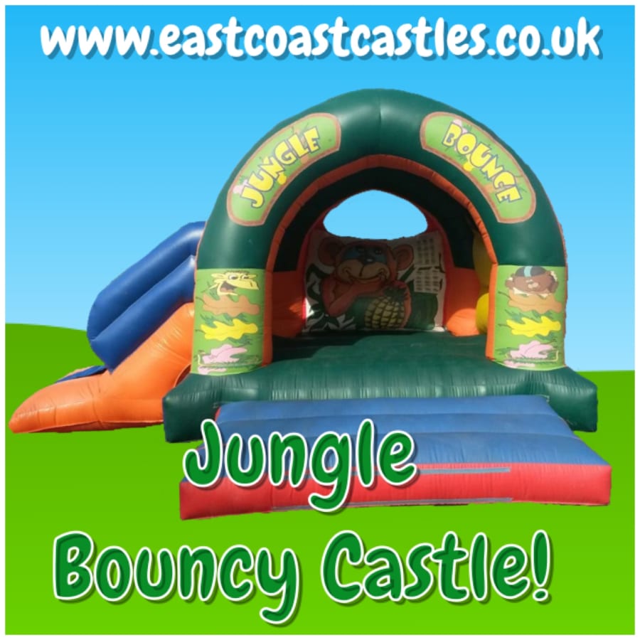 East Coast Castles Jungle Bounce Bouncy Castle has all the feel of the jungle, with its green forest theme and monkeys on the background, your little monkey can bounce about in the large bounce area, before taking the leap of faith and sliding down the slide back to earth, and starting their adventure all over again, this will keep your little ones busy for hours.